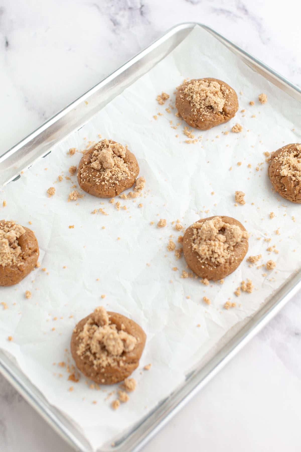 - Scoop out the cookie dough and press an indent in the top of the cookie, then add a generous scoop of the crumble.