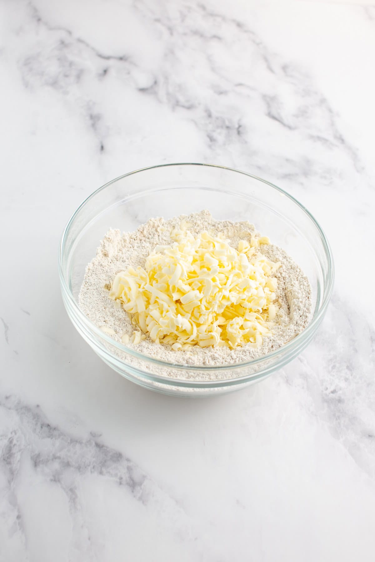 Step 2. Then add in the grated frozen butter in the dry ingredients.