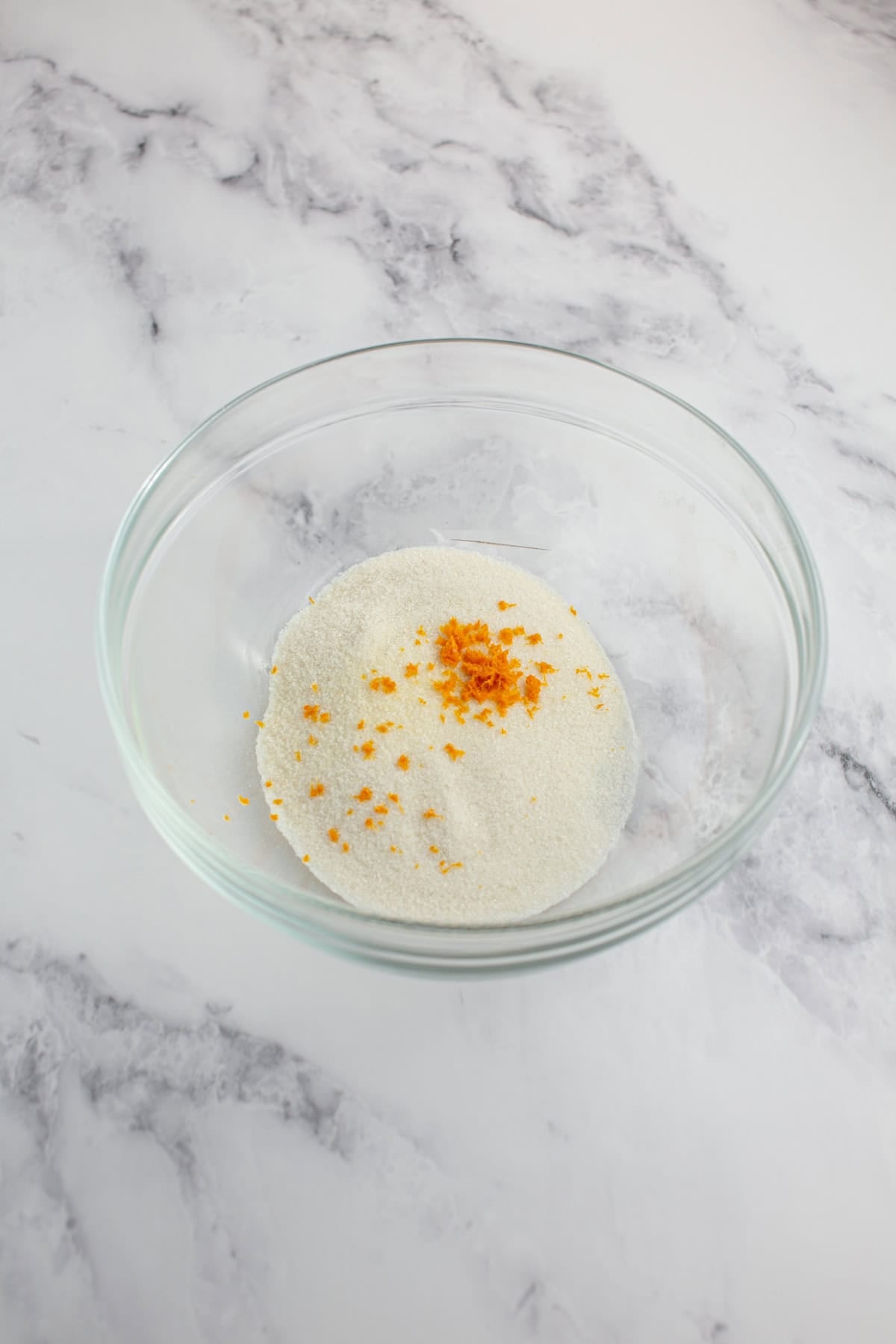 - In a bowl, mix together sugar and orange zest. Massage together.1 cup Sugar, 2 teaspoons Orange Zest