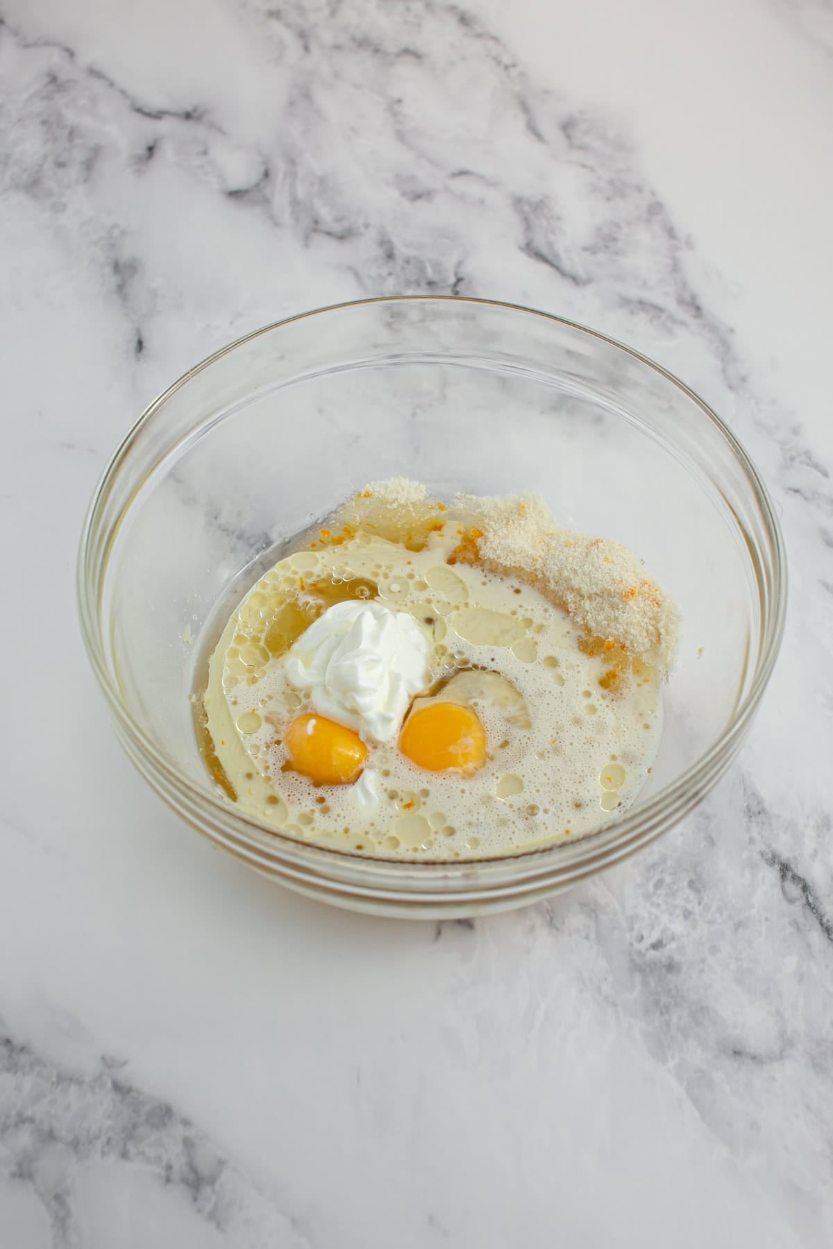 - Then add in oil, Greek yogurt, eggs, milk, and vanilla.1/2 cup Oil, 1/3 cup Greek Yogurt, 1/3 cup Milk, 2 Eggs, 2 teaspoons Vanilla