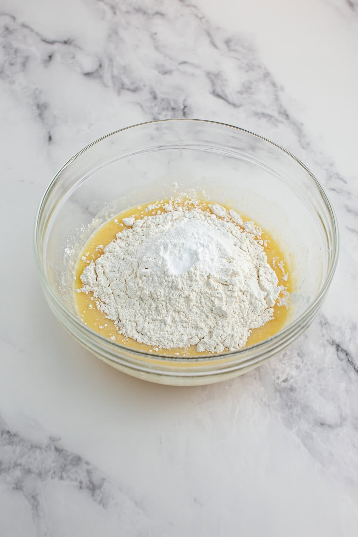 - Gently add in flour, baking powder, and baking soda.2 cups Flour, 2 teaspoons Baking Powder, 1/2 teaspoon Baking Soda