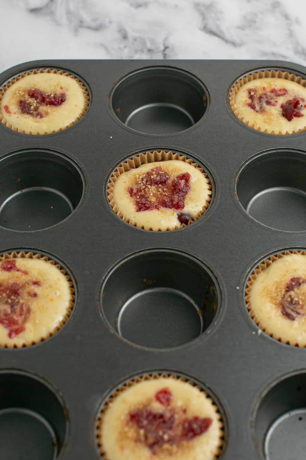 Step 4. Add a small scoop of muffin batter into the muffin cups, then add in a little bit of cranberry sauce. Add in another small scoop of muffin batter before adding Turbinado sugar to the top of the muffins.