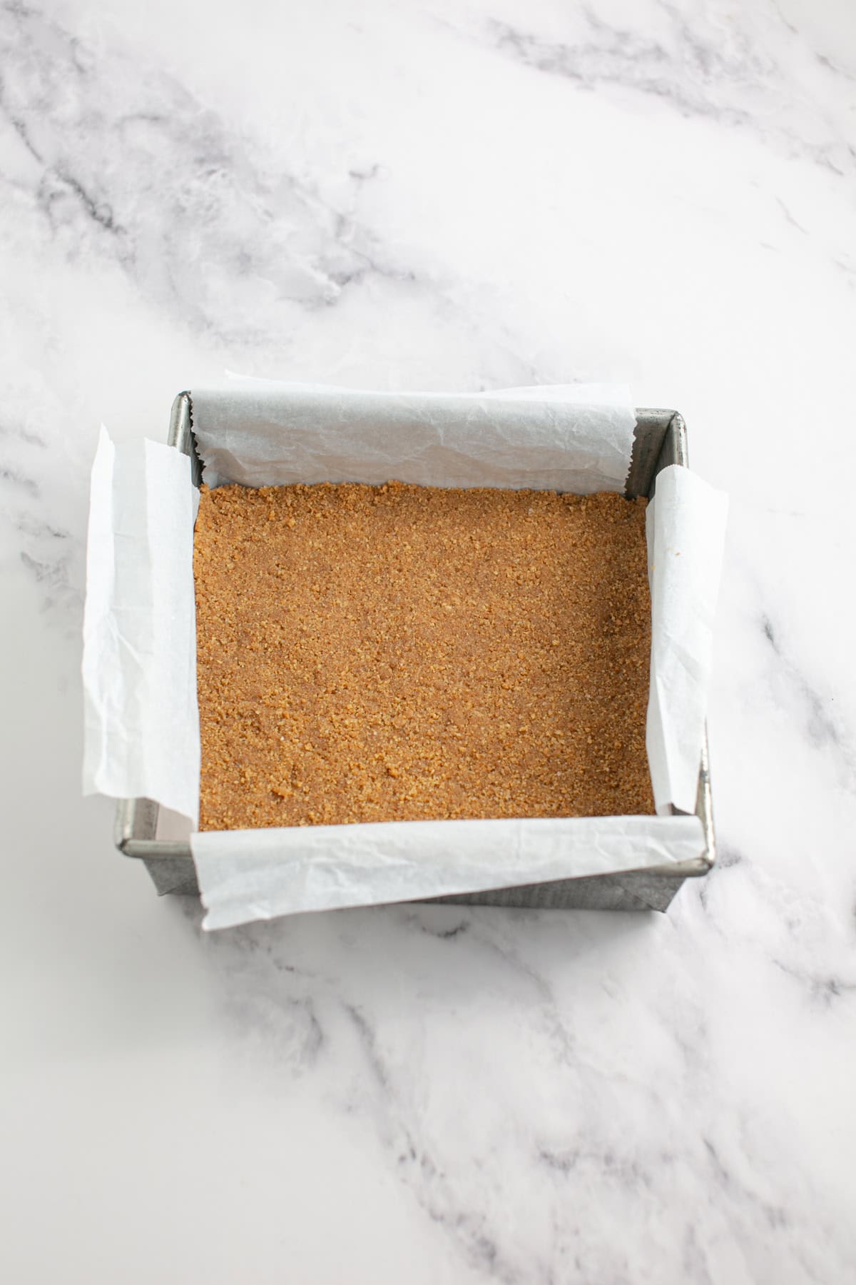 Step 2. In a parchment lined pan, add the graham cracker mixture and press into the pan. Bake for about 8-10 minutes.