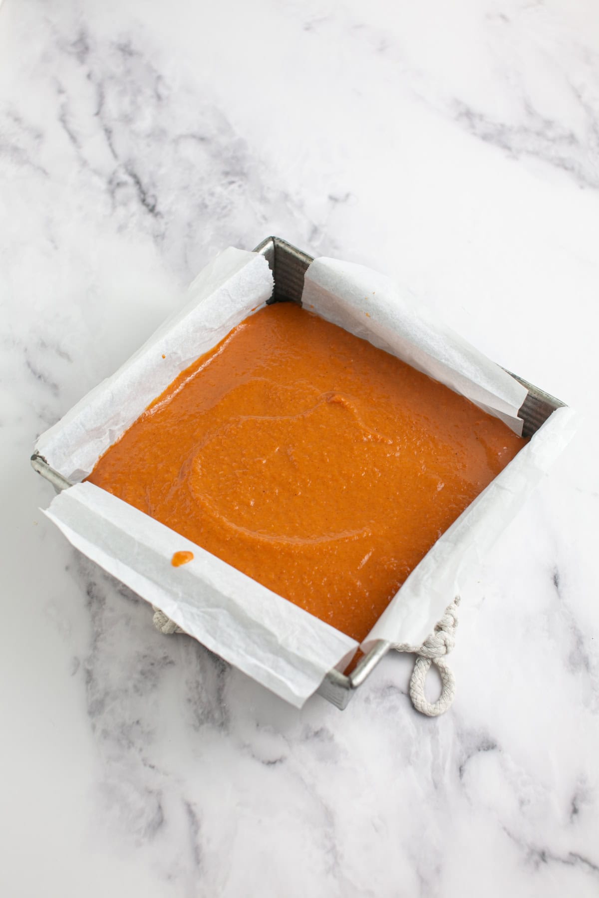 - Stir everything together, then pack into the bottom of parchment-lined square pan!