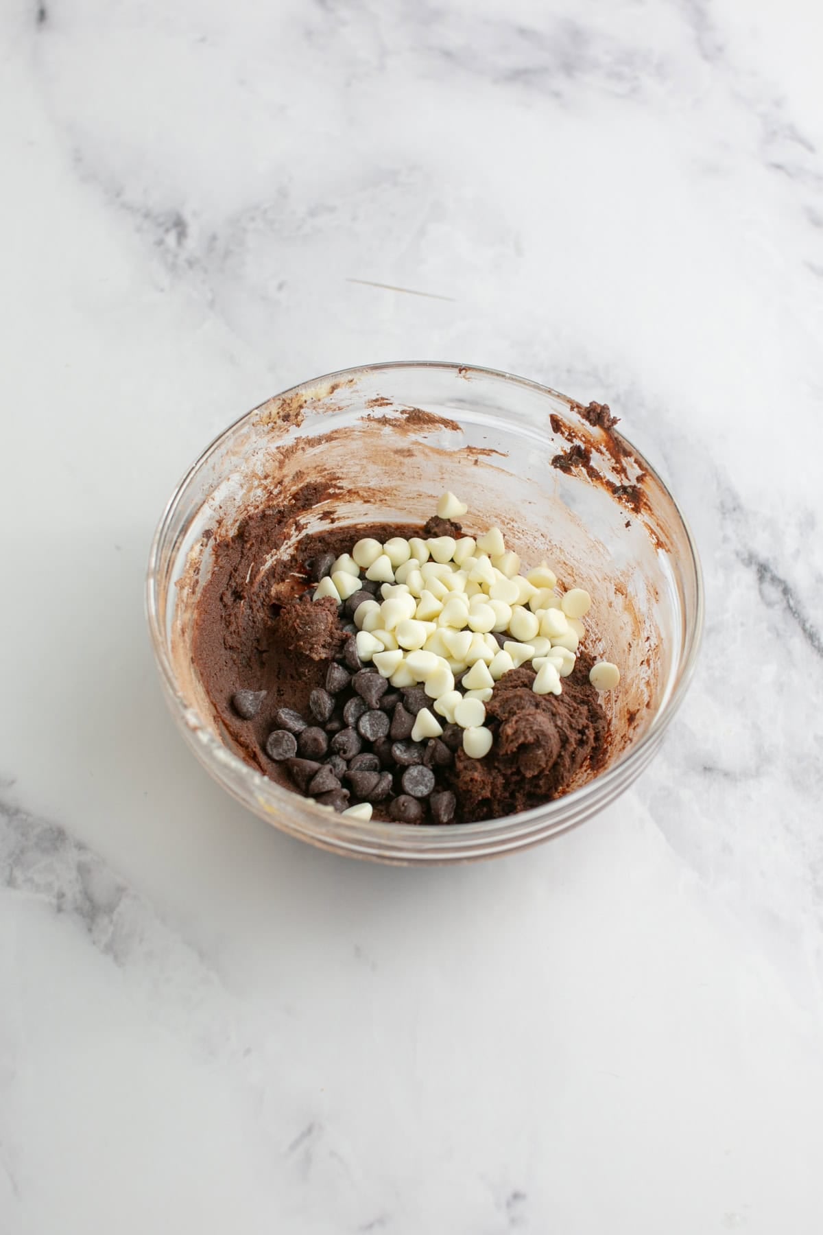 - Mix in both chocolate chips2 tablespoons Dark Chocolate Chips, 2 tablespoons White Chocolate Chips