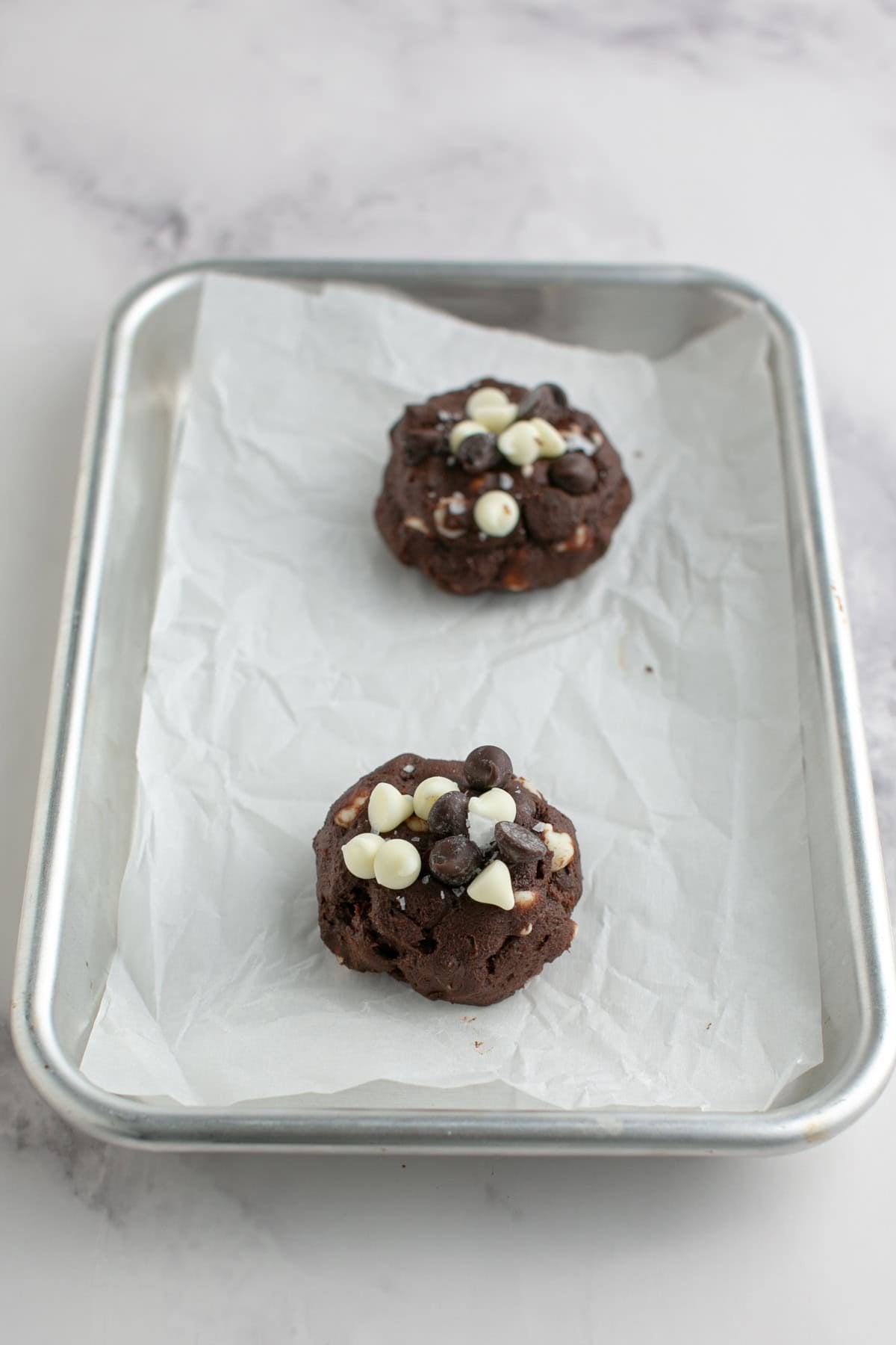 Step 4. Scoop onto a parchment lined baking sheet before adding more chocolate chips. Add a pinch of salt and bake!