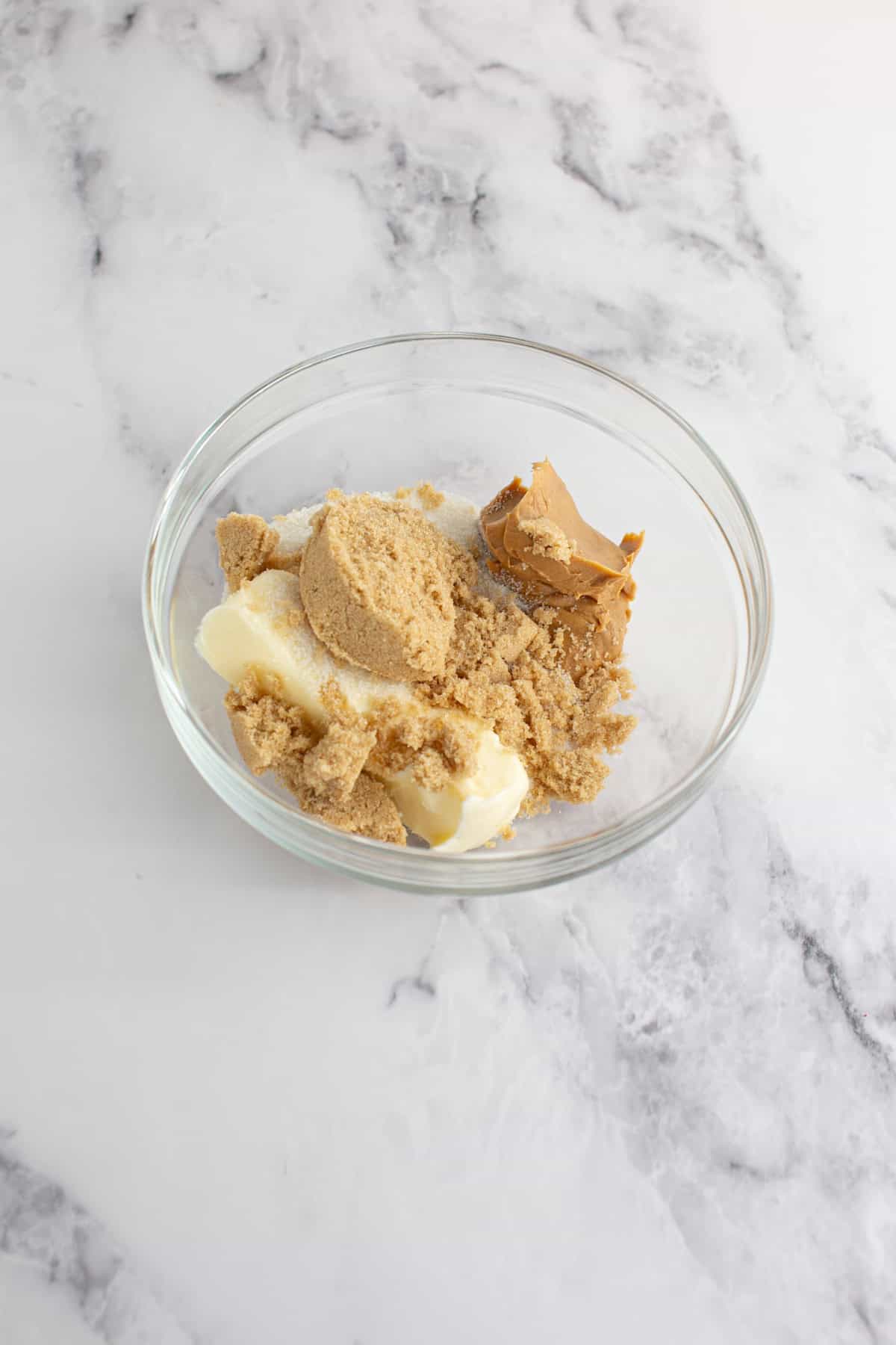 Step 1. In a large bowl, add butter and peanut butter. Mix together with brown sugar and sugar.